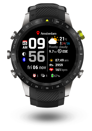 The watchface uses antialiased pro graphics to get impressive results even with the limitations of the hardware in graphics display. Obtaining a modern and smartwatch-like look, while preserving the essence of a sports watch. Also, it is fully customizable so it can suit your likes and match your style!! Registered users can change from the settings menu almost every graphical aspect of the watchface! Language, Colors, font sizes, units, data format, data presentation...!